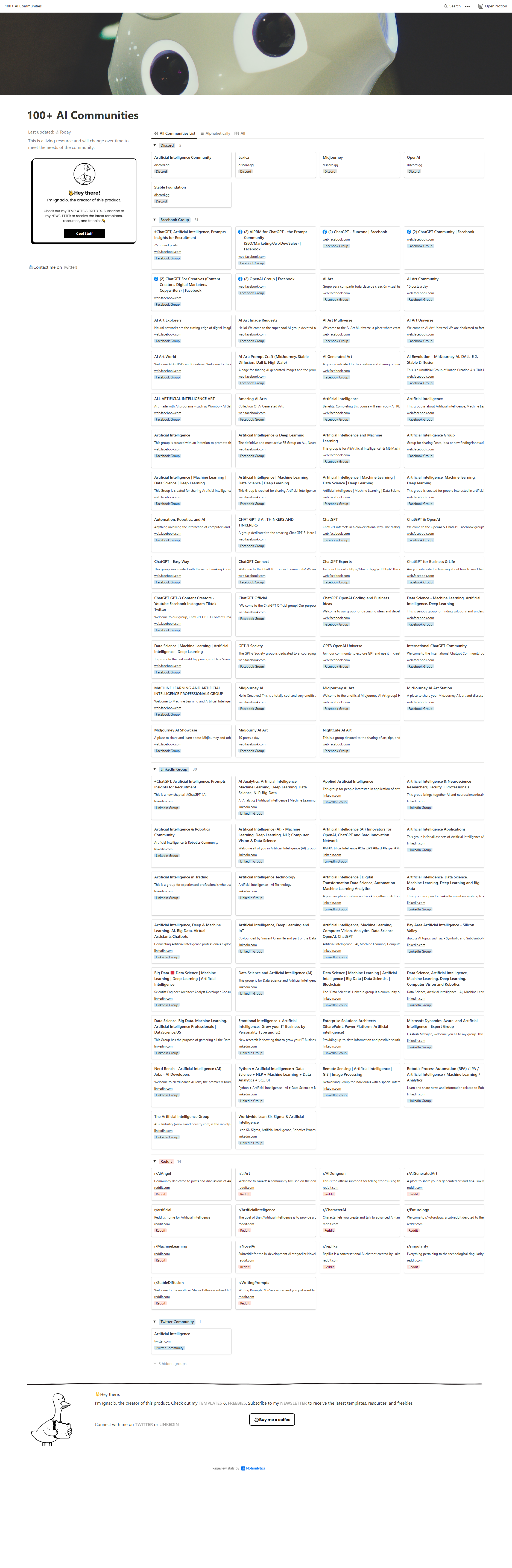 - 100+ AI Communities is a comprehensive collection of AI communities and resources, designed to help AI enthusiasts stay updated on the latest trends and developments in the field of AI.