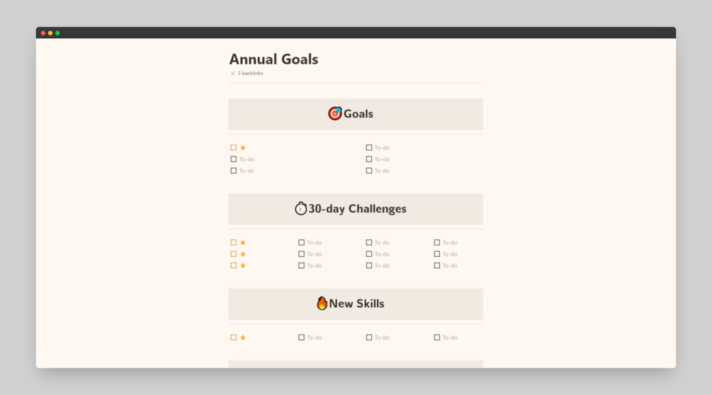 Set your goals for the year with the printable "Annual Goals" template. You can add challenges, trips and more.