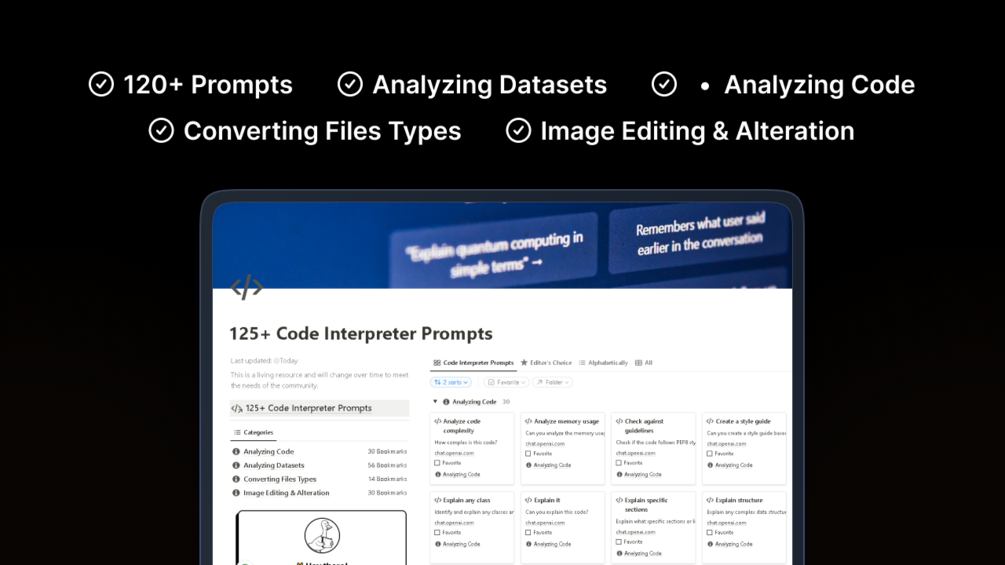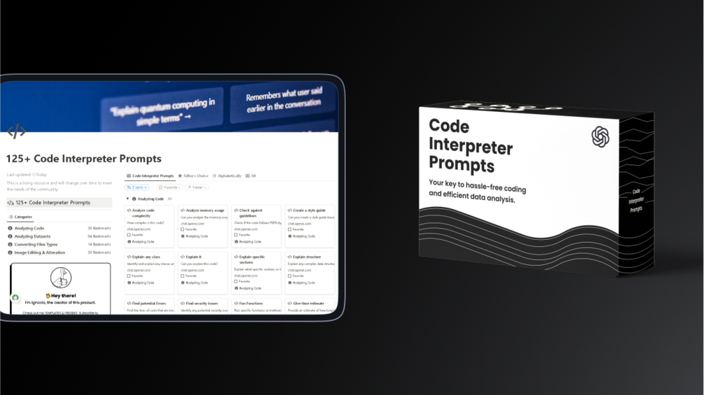- "125+ Code Interpreter Prompts" is a carefully curated collection of prompts that provide specific solutions for coding and data interpretation tasks. It’s your go-to companion for an efficient and streamlined coding experience.This is not just a database of prompts; it's a gateway to untapped possibilities and enhanced efficiency in your AI model's performance.
