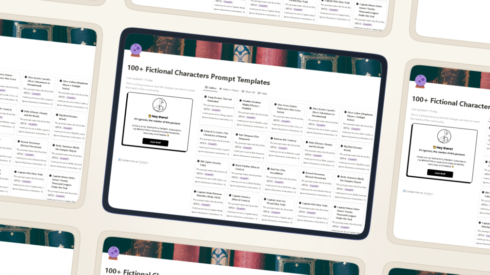 - "100+ Fictional Characters Prompt Templates" is a collection of prompts, designed to guide ChatGPT into convincingly playing a variety of beloved fictional characters. It's your ticket to immerse yourself into an AI-driven world that feels surprisingly human, bursting with the personalities you love and respect.