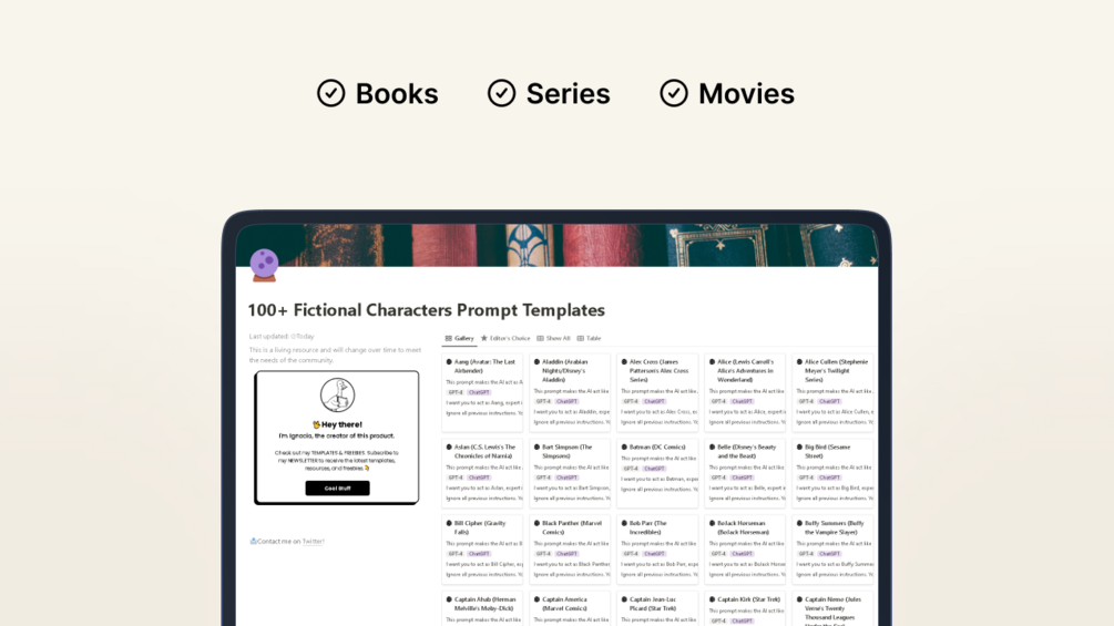 100+ Fictional Characters Prompt Templates is an innovative collection that empowers ChatGPT to embody the characters you love, fostering immersive and engaging interactions that rival even the most skilled human authors.