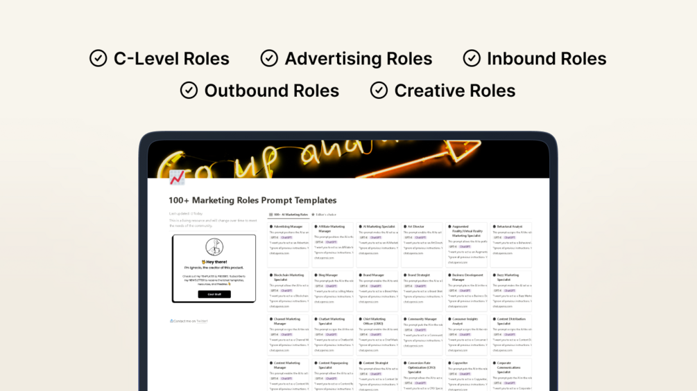 Don't miss out on this exclusive opportunity to supercharge your AI with the "100+ Marketing Roles Prompt Template."