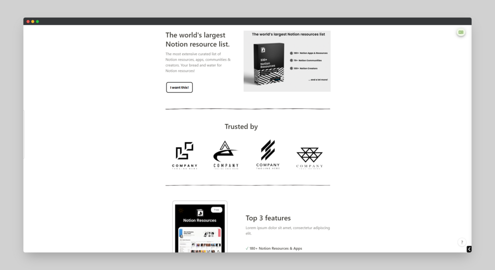 An aesthetic product landing page template that you can share with anyone, made with Actions widgets, all hosted in Notion.