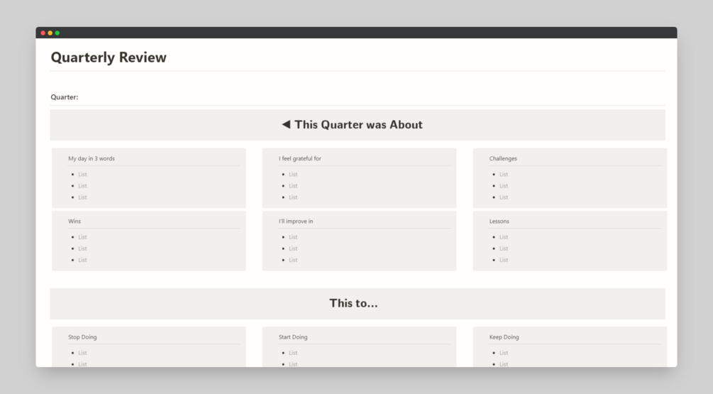 - Review each quarter and reflect on it with the "Quarterly Review" printable template.