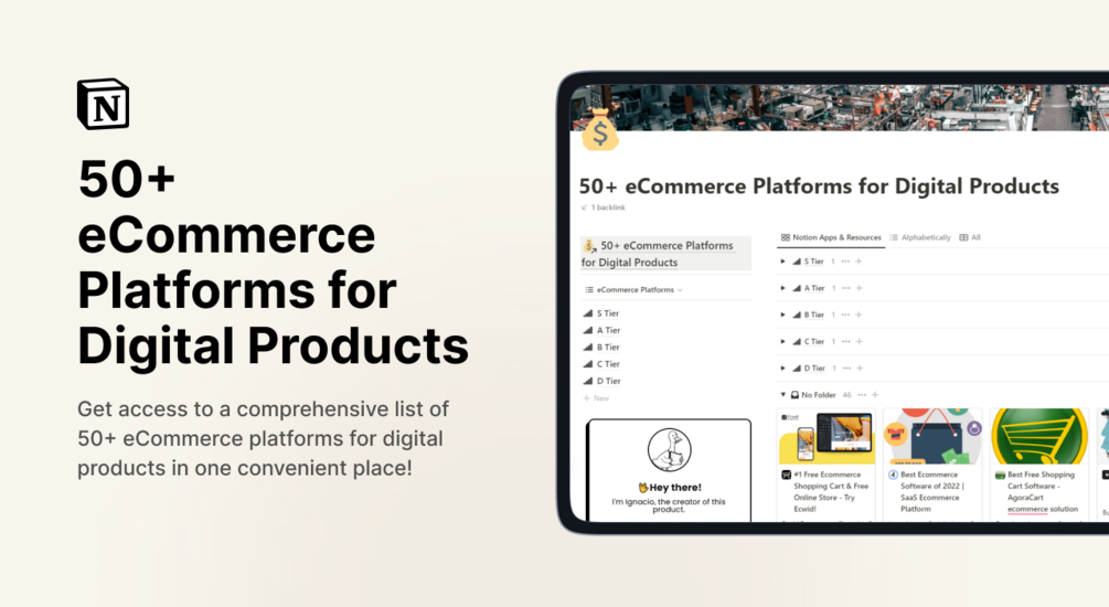 Don't waste any more time trying to find the perfect eCommerce platform. Get access to our 50+ eCommerce platforms for digital products curated link directory and make the process of finding the right platform for your business a breeze.